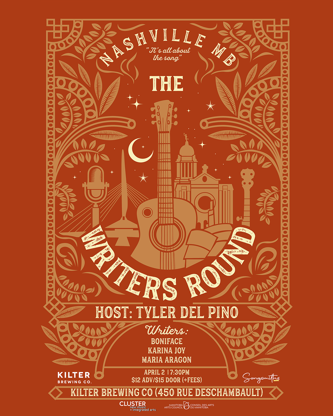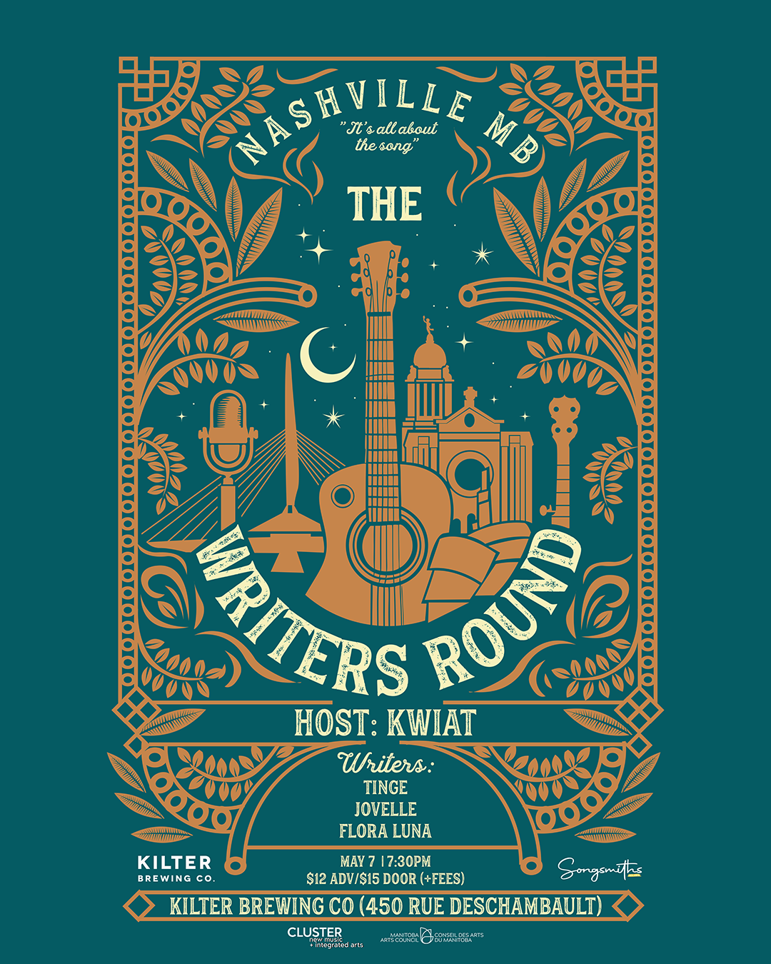 Come enjoy the monthly Nashville MB series as the cozy taproom at Kilter Brewing Co. transforms into a Nashville-style Writers Round. Each month features intimate performances by four of Manitoba’s finest songwriters who will share their songs in turn. One performs a song, followed by the next writer, and the next, and so on. Each songwriter might join in with the others, add harmonies, contribute a guitar riff, or just listen. Writers talk about how and why they wrote the songs, and there are always lively stories and interaction between the writers.